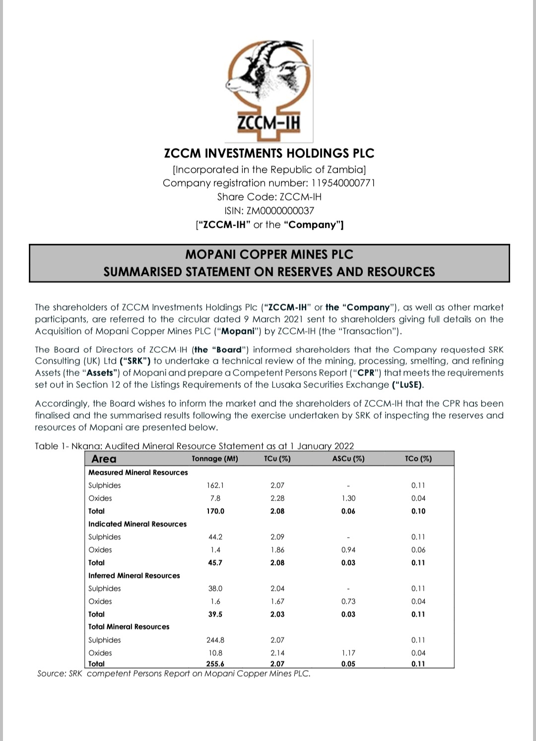 Zccm Ih Plc On Twitter Stock Exchange News Service Sens Announcement Mopani Copper Mines Plc Summarised Statement On Reserves And Resources Https T Co Jnirlg6xzp Twitter